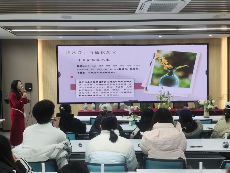 值学校建校九十周年之际,为深入推进美育教育,培养学生审美观念及感知、鉴赏与创造美的能力,加深学生对中西方花艺文化的理解,培育跨文化意识和中西方文化比较思维,外国语学院于12月24日在九教209教室开展了主题为“花艺设计”的美育实践活动。学院特邀芜湖宜香文化传播有限公司创始人、2003年芜湖市插花技能竞赛亚军、国家注册高级花艺师张群老师担任主讲人。