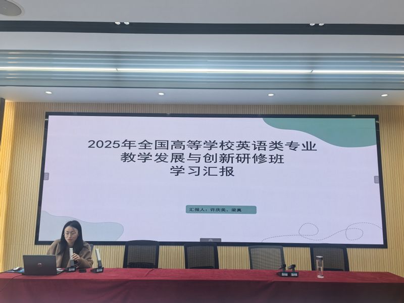 梁真在“2025年全国高等学校英语类专业教学发展与创新研修班”的学习汇报中,融合了各位学科前沿专家的报告内容。她从翻译教学、拓展区域国别研究、提升教师文学素养的多维路径、探索英语专业核心能力等方面对教学理念进行了升级,致力于共同塑造面向未来、更具复合能力的英语专业人才。