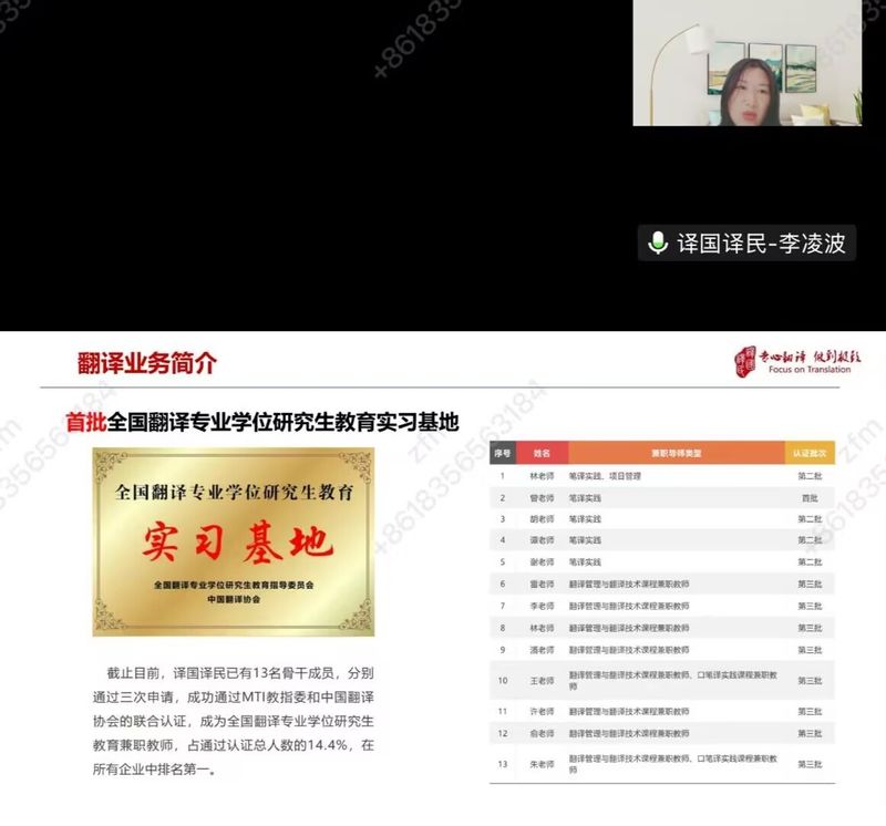 随后,译国译民公司代表李凌波详细介绍了公司的发展历程、业务范围、企业文化及行业地位现场带领大家“云参观”公司内部环境,展示真实工作场景欢迎外院学子积极加入译国译民大家庭。然后,实习管理老师林老师围绕本次实习的具体安排、任务内容、考核方式及注意事项进行了详细讲解,明确实习目标,理清学习路径。她表示,实习期间将全程陪伴指导,确保每一位同学都能在实战中有所收获、有所成长