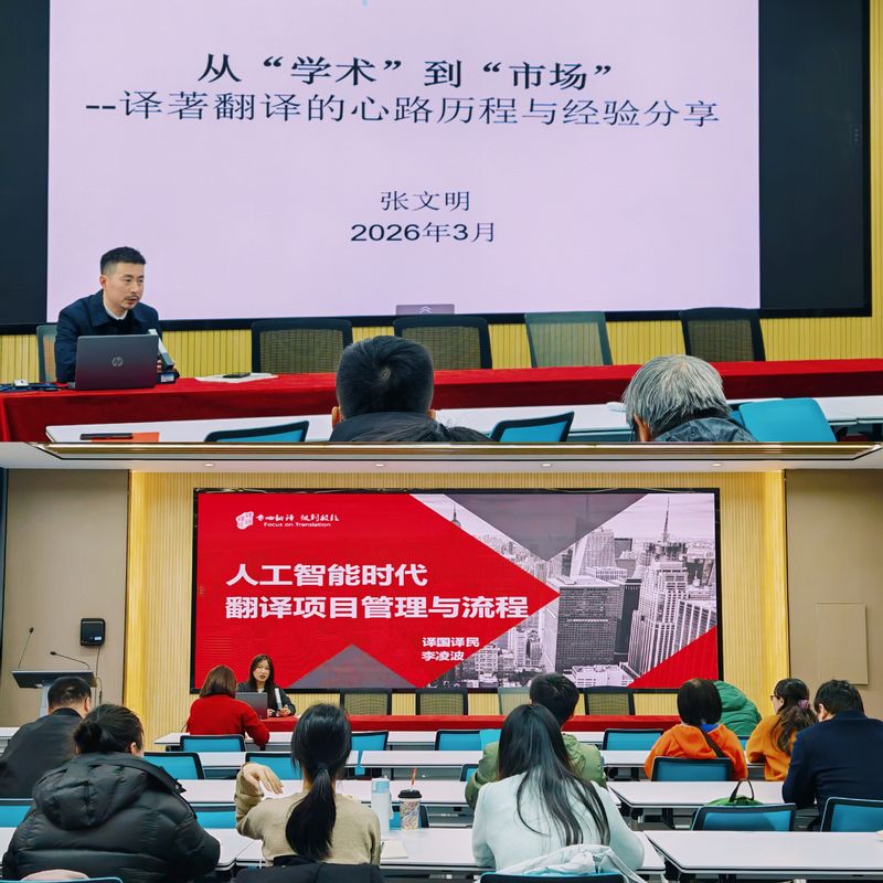 报告会后,参会师生围绕两位专家的分享,结合自身翻译实践与研究方向,就AI技术与人工翻译的协同发展、译著翻译的质量把控、翻译项目管理的实操难点等问题展开热烈讨论,两位专家逐一耐心解答,交流互动氛围浓厚。