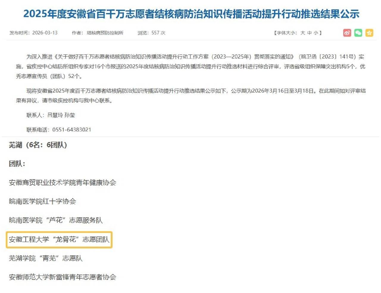 316-18日,2025年度安徽省百千万志愿者结核病防治知识传播活动提升行动推选结果及2026年度志愿者团体培育计划评审结果在安徽省疾病预防控制中心网站公示。我校外国语学院“龙骨花”结核病防治宣传志愿团队获评2025年度优秀志愿者团队称号,并在2026年度志愿者团体培育计划中获得一等资助。
