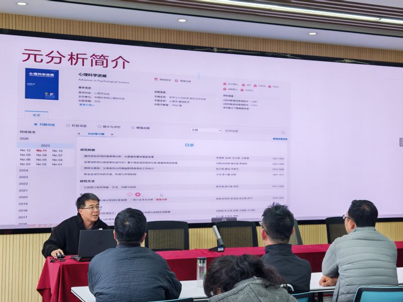 报告会上,沈乐先以简洁明了的语言介绍了元分析的概念,阐述了其作为定量综合研究方法的核心价值,提升了科研结论的科学性与可靠性,并结合相关领域实例,让师生对元分析的应用场景有了清晰的认知。报告以心理科学进展元分析论文自检报告为具体案例,分别从明确研究问题与研究设计、规范文献检索与筛选流程、做好数据提取与质量评估、科学开展统计分析与结果解读四个关键环节详细拆解了元分析研究的完整路径,并结合自身研究经验和语言与脑科学团队的研究方向,针对元分析应用中的难点问题分享实操技巧、讲解数据提取、编码规范及质量评价方法,提出了元分析方法在相关领域的应用建议。