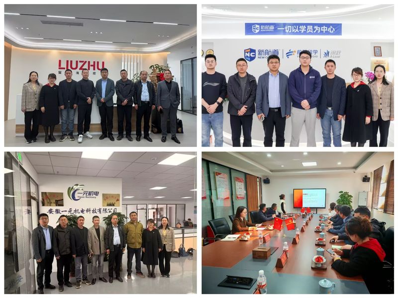 调研团队先后走访了新加坡留助海外控股有限公司、安徽一元机电科技有限公司、新航道合肥学校、安徽知了教育科技集团有限公司,与各企业负责人深入座谈,围绕党建共建、人才培养、实习实训、跨境贸易、学生就业等议题充分交流。