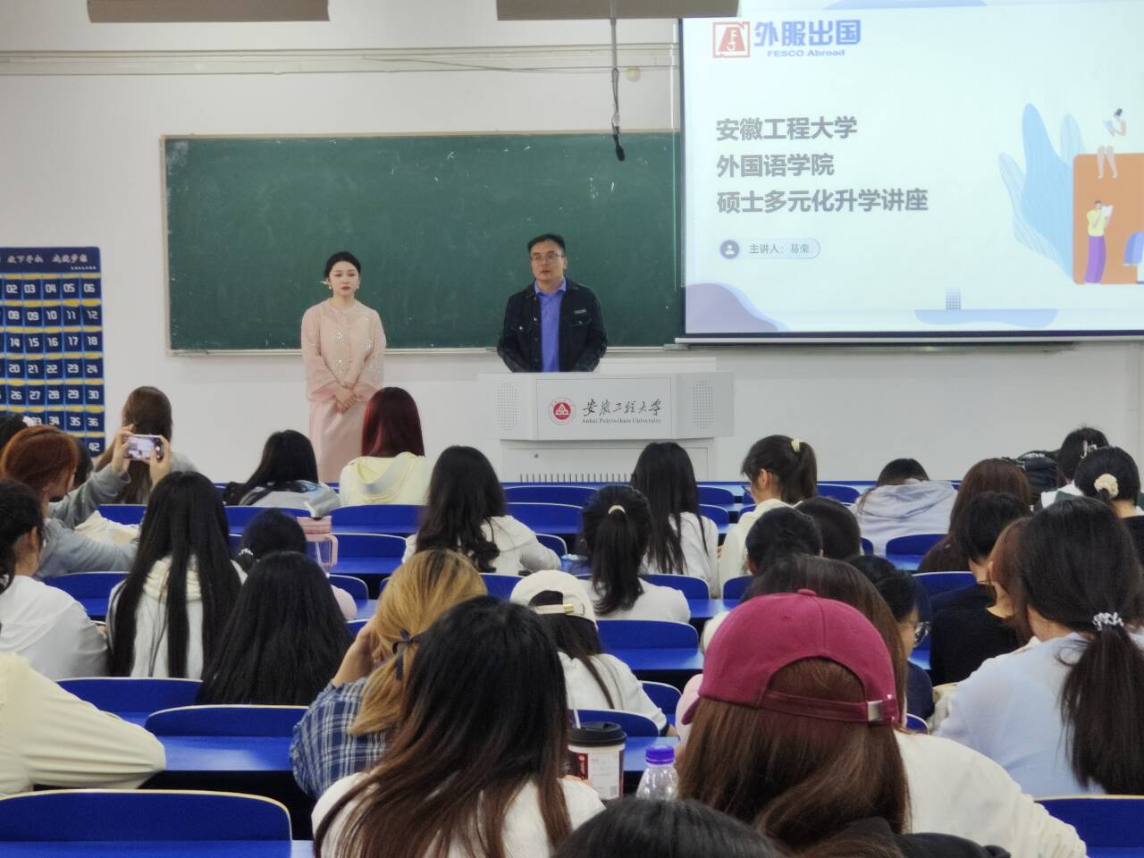 3月20日下午在6教111教室,外国语学院成功组织了主题为“多元化升学”的学业规划宣讲。本次活动邀请到了学院副院长李新国以及安徽省金宁外事服务有限公司的易荣老师,24级全体同学和带班辅导员参与讲座。