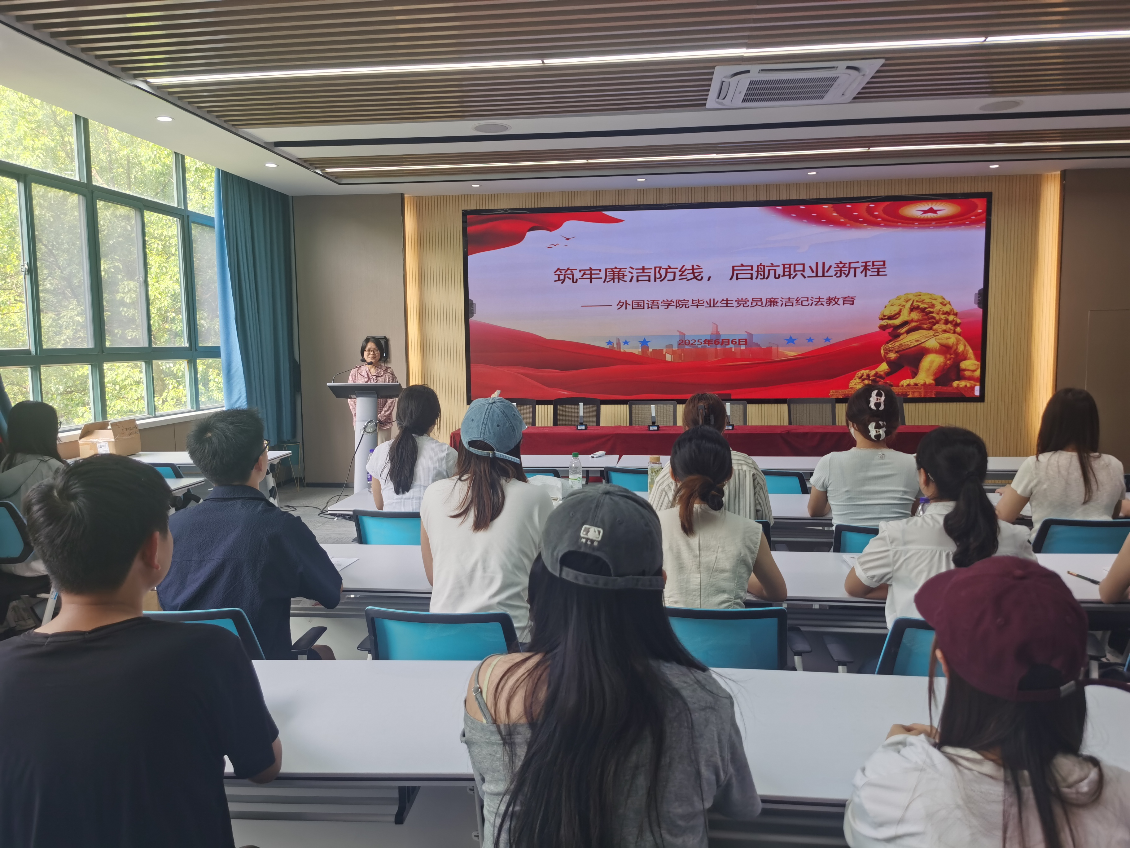 为引导毕业生党员树立廉洁从业意识,筑牢思想防线,扣紧职业生涯“第一粒扣子”。6月6日下午,外国语学院组织开展了“筑牢廉洁防线,启航职业新程”廉洁纪法教育主题党课,学院党委副书记、纪委书记李校林为即将步入职场的毕业生党员们送上了一份特殊的“毕业礼”。