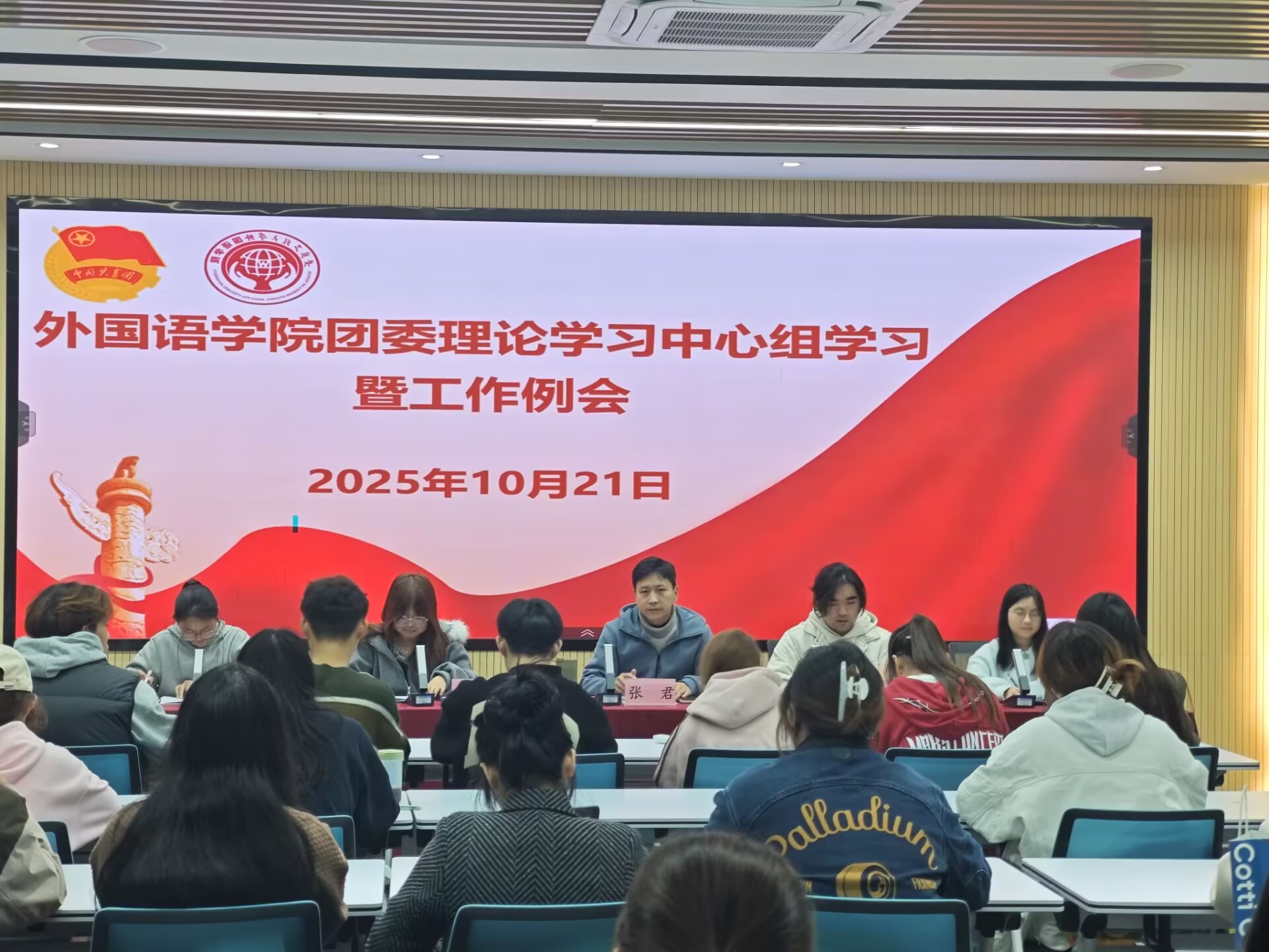 10 月 20 日 18:00,外国语学院团委理论学习中心组 10 月份集中学习暨工作例会在 9 教 209 举行。院团委书记张君、院团委学生会成员以及各年级团支书、班长参加了此次会议。