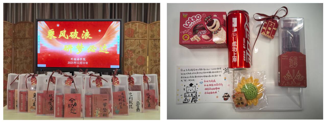 最令人动容的环节,莫过于暖心礼包的发放。老师们亲手将满载关怀的礼包送到每一位学生代表手中,礼包里的每一件物品都暗藏巧思:实用的文具套装助力规范作答,印着定制姓名的可乐寓意“快乐冲刺”,向日葵挂件承载着“一举夺魁”的美好期许,能量满满的牛轧糖为脑力消耗“充电续航”,而学弟学妹们亲笔书写的祝福卡片,更让这份关怀多了份青春同行的温度。“这份礼包太贴心了!不仅有实用的物资,更有满满的精神动力,我一定会把学院的关怀转化为冲刺的底气,全力以赴不负众望!”英语221班王宇鑫同学的发言道出了全体考研学子的心声。 此次慰问活动既是学院人文关怀的生动体现,更是为同学们考研冲刺注入的“强心剂”,提振了备考士气。据悉,外国语学院始终高度重视考研服务工作,通过 “考研动员会”、“考研经验分享会”、复试面试指导以及调剂信息收集共享等系列举措,为考研学子保驾护航。