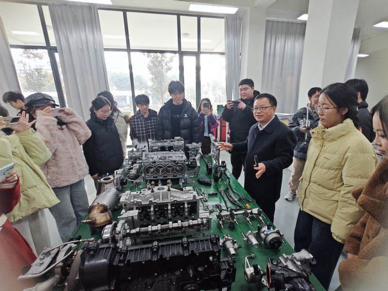 为深入探究人工智能时代汽车发展趋势,打造具备工程底蕴的“外语+”新文科人才培养模式,12月11日下午,外国语学院2023级英语专业工程翻译方向的同学们在《工程英语笔译》主讲教师崔燕的带领下,前往我校国际工程师学院校区新能源汽车专业实验室开展现场教学活动。机械与汽车工程学院的肖平教授热情接待了学院师生一行,并全程陪同讲解。