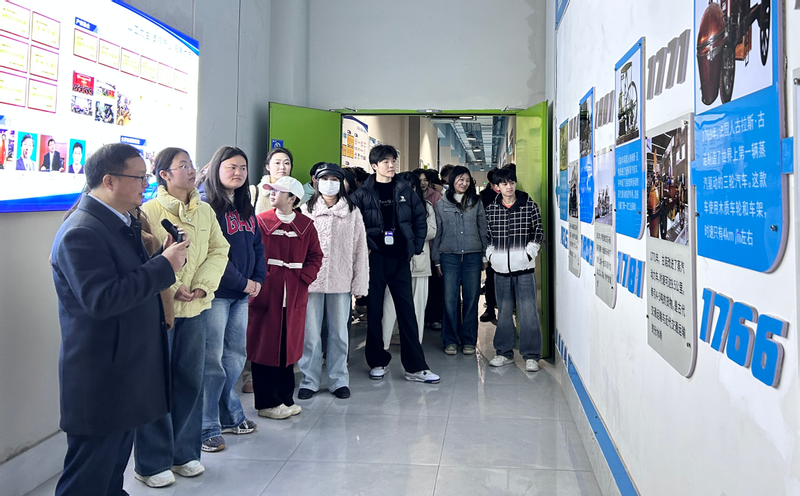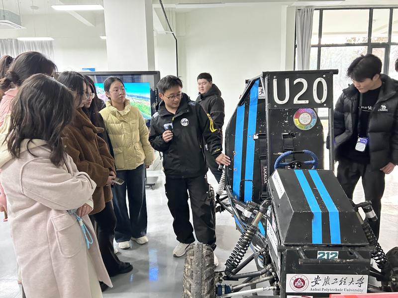 结合展板,肖平教授生动讲解了汽车的发展与车型演变历程,梳理了汽车工业从传统机械到智能出行的演进脉络,帮助大家建立起对汽车产业发展的整体认知。在智能汽车线控底盘系统安徽省重点实验室内,同学们观摩了先进的科研设备、创新产品原型及相关产学研合作项目,进一步深化了对汽车技术研究与产业实践结合的理解。同学们纷纷表示收获颇丰、受益匪浅,对《工程英语笔译》课堂上学习的汽车专业英语术语和相关英汉翻译材料内容有了直观具体的理解,这对精准把握术语内涵、理解文本内容逻辑关系、准确开展翻译工作起到了重要作用,对今后的专业学习和职业理解产生了积极影响。