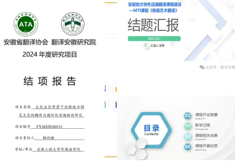 基地教师积极参加安徽省译协“翻译安徽”研究项目,获批项目两项:“文化自信背景下安徽地方特色文化的国际传播路径研究”与“地方特色话语进课堂项目——铁画艺术翻译”。