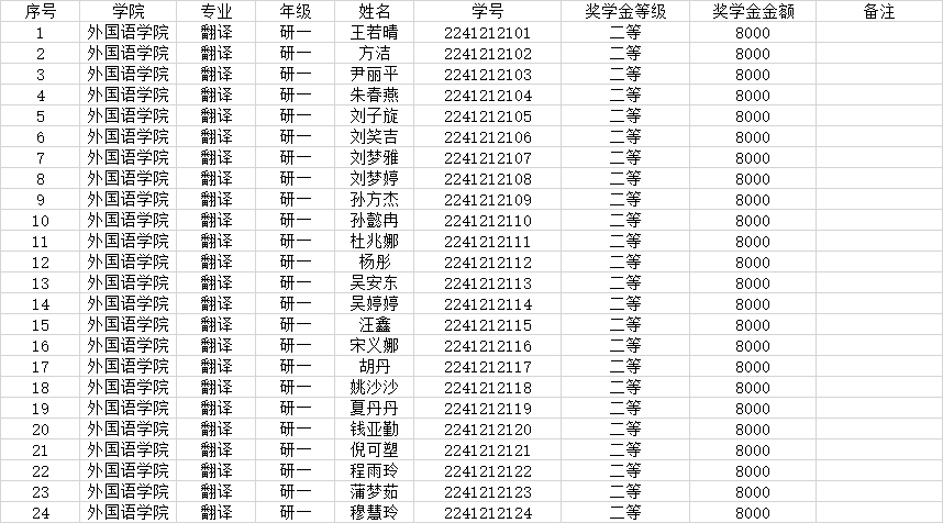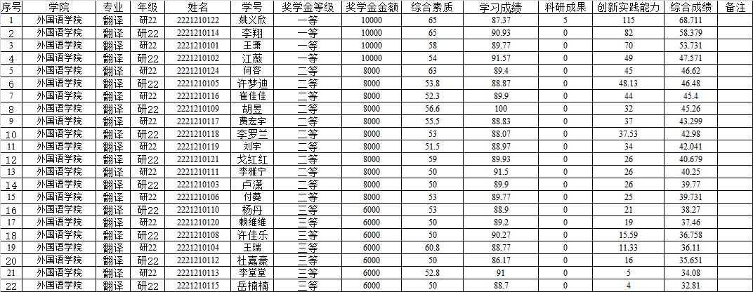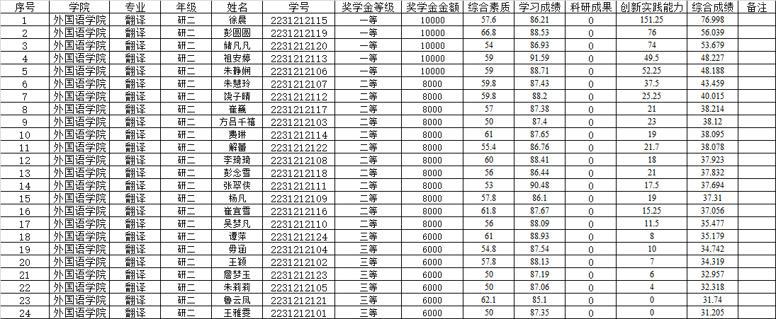 根据《《RayBetApp官网下载 研究生学业奖学金综合评审办法》(校研字〔2021〕16号)(适用于2022级、2023级研究生)和《RayBetApp官网下载 研究生学业奖学金综合评审办法(修订)》(校研字〔2023〕12号)(适用于2024级研究生)的文件要求和《外国语学院研究生学业奖学金评定参考方案》,经学院评审委员会评审,现将评审结果予以公示。公示期限为5个工作日(2024年9月20日至2024年9月26日)。
