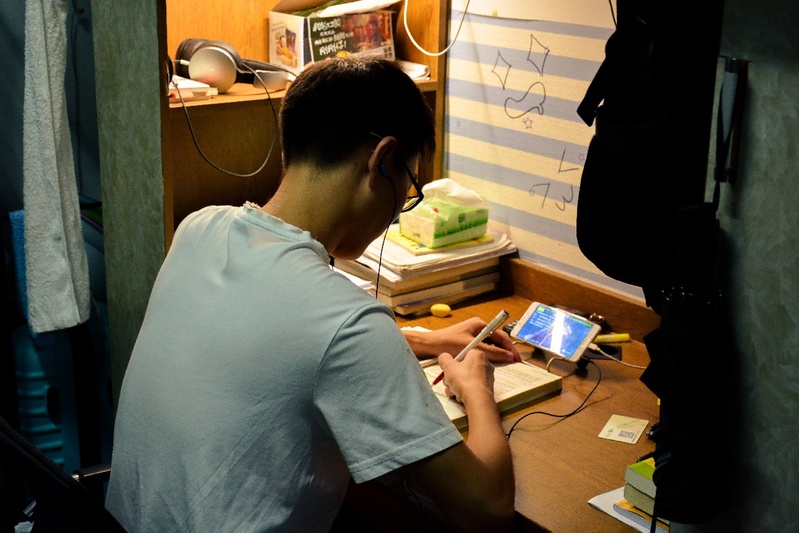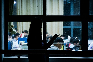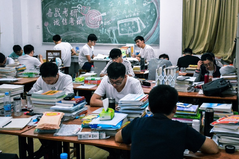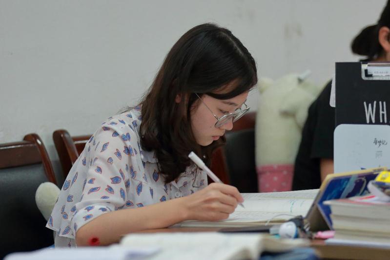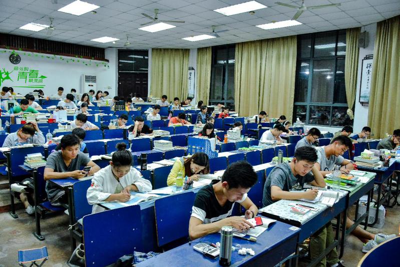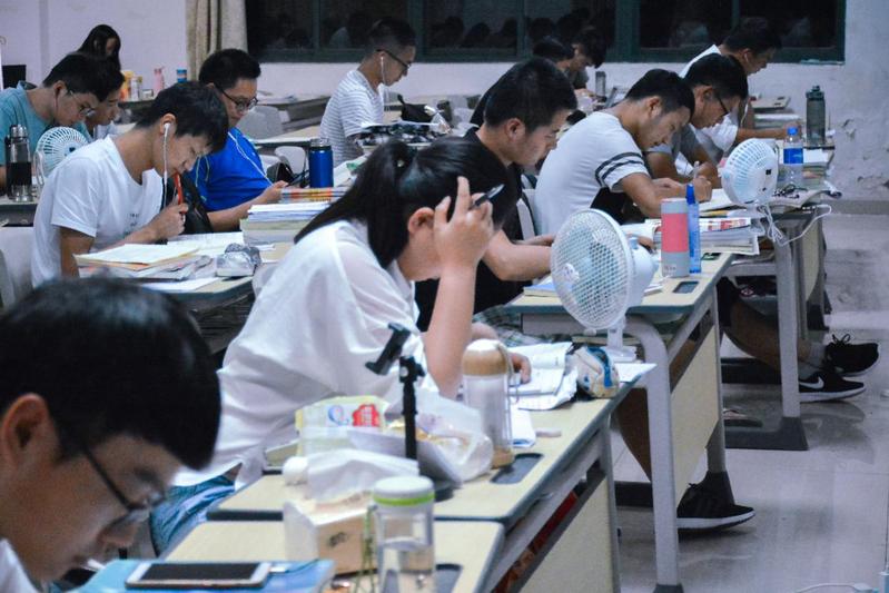 偌大的考研教室里,所有人都在埋头学习,只剩下学生们的写字声和翻书声。