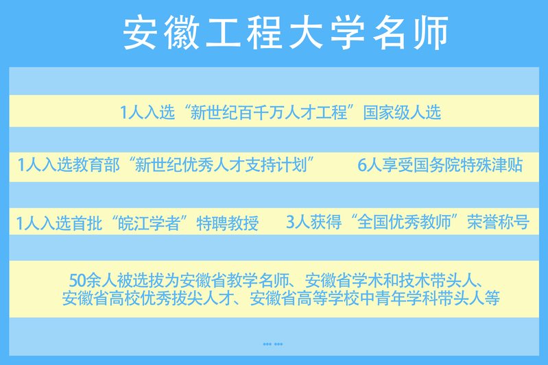 教职工近1300人,其中专任教师1000余人,具有博士、硕士学位的教师在专职教师中的占比超过90%。学校聘请一批包括中科院院士、 工程院院士在内的国内外知名学者担任兼职教授,引进高层次人才担任学科领军人才, 50余人被选拔为安徽省教学名师、安徽省学术和技术带头人、拔尖人才、高校中青年学科带头人等。
