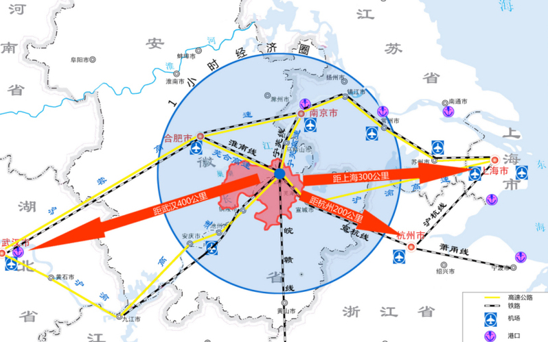 芜湖承东启西,临江达海,是华东地区仅次于上海和南京的第三大综合交通枢纽,4小时陆路交通半径内,覆盖中国中东部最发达的地区。目前已经实现30分钟到达南京,150分钟到上海。商合杭高铁全段预计2020年11月1日正式开通运营,建成通车后,将实现60分钟到杭州,3小时到武汉,4小时到北京、福州。