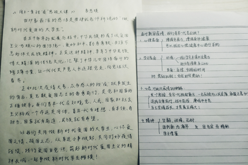 应化拔尖171班的李思琪和双胞胎妹妹、就读于其他高校的李思钰,共同观看同上一堂战“疫”思政大课,认真撰写学习心得。李思琪同学看完直播后说,在此次的疫情大考中,众多感人的“战疫”故事发生的背后,是无数爱国志士的奋勇前行,是党和国家的正确领导。我们青年一代应当积极主动担当,学好专业文化知识,在社会活动、科技创新等方面展现风采,心怀爱国之情、报国之志,做新时代大学生。