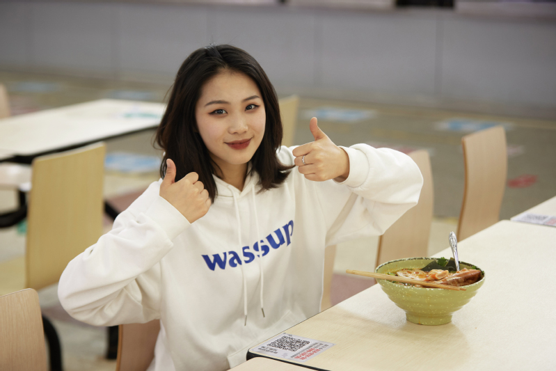 正在挑选菜品的李诗琪同学介绍道:“我喜欢吃火锅、麻辣烫,在学校严格管理期间,幸好有一食堂的麻辣烫让我解馋。我特别喜欢吃这家的麻辣烫,加上满满的麻酱,放上一勺辣油、麻油,半勺蒜末。油条吸满汤汁,粉丝裹满调料,蔬菜营养爽口,最后一定要喝上几口浓郁的骨汤,简直就是人间美味!”
