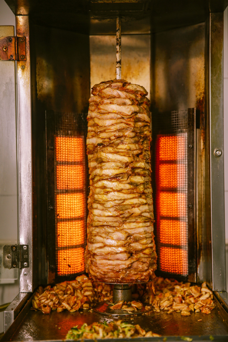 一份优秀的烤肉要经历层层“烤”验才能出现在同学们的餐桌上,一片片肉穿过一米长的铁串,再抹上酱料放进烤炉,为了受热均匀,烤制过程中还需不停旋转。在炉火的照耀下,金黄色的烤肉发出滋滋声响,一滴滴热油顺着肉的纹路慢慢滑下亦或是在烤炉中起舞。经过高温烤制的肉本就美味,用秘制的酱料翻拌均匀后配上爽口解腻的黄瓜丝与生菜,更是令人垂涎欲滴。咬下一口,层次丰富的肉汁在口中流淌,嫩滑、焦酥、鲜咸、麻辣一瞬间都在口中翻腾雀跃。