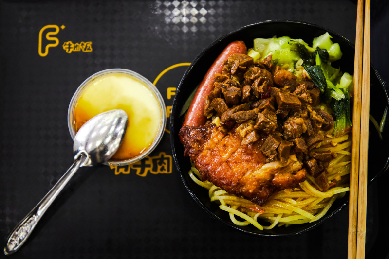 观之,色彩鲜艳;闻之,垂涎欲滴;食之,口感丰富。软糯的白米饭,上面铺着一层碎牛肉丁和健康爽口的土豆丝、青菜,再配上一根烤肠和一小碗嫩滑的鸡蛋羹,精心搭配的肉蔬营养均衡。淋上一勺秘制底汁,瞬间为这一碗牛肉饭注入灵魂,令人大快朵颐。何文昊同学笑着说:“中午吃上一碗牛肉饭,下午长跑训练时感觉浑身有使不完的力气!”