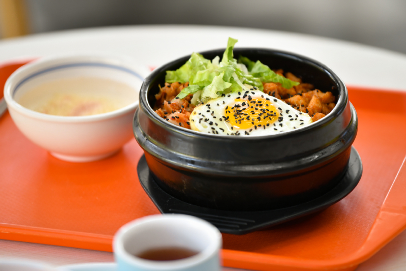 火苗烤着石锅,等待着白米饭发出滋滋的声响,刚做好的石锅拌饭还听得见冒油的声音,揭开盖子,浓浓的烟火气扑面而来,包裹着丰富的酱汁、已十分入味的肉片,配上一颗滑嫩的“温泉蛋”,佐以黑芝麻和生菜的点缀,色、香、味俱全。将“温泉蛋”与米饭搅拌均匀,便使每一粒米饭间都浸满了浓稠的蛋液与香气,品尝一口,享受着顺滑、细腻的口感,顿时幸福感倍增。