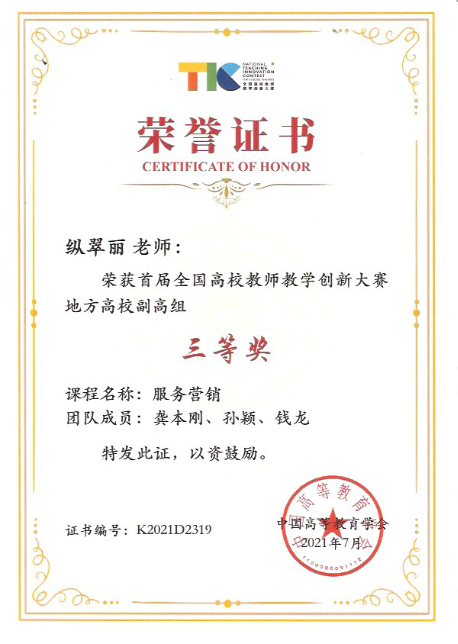纵翠丽老师长期从事“OTO”线上线下混合式教学模式改革研究,通过“目标层级切分、内容结构重塑、教学多维互动、四轮并驱培养、课程思政引航”等多项教学创新举措,有效克服了市场营销专业课程中的教学痛点和难点问题,特色鲜明,成果显著,主持申报的“混合式教学理念下市场营销专业课教学创新”成果获得安徽省教学成果奖二等奖,主讲课程《服务营销》获批省级智慧课堂试点项目,此课程也被认定为首批国家级线上线下混合式一流本科课程。