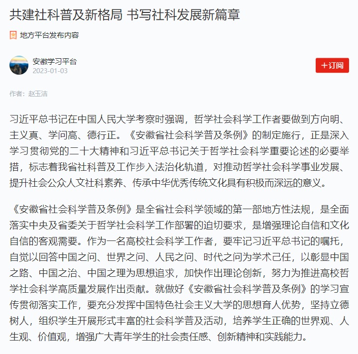 文章以《共建社科普及新格局书写社科发展新篇章》为题,从“丰富内涵,创新社科普及形式”“搭建平台,打造社科普及品牌”“健全机制,构建大社科普及格局”三个方面畅谈社科普及工作。文章认为,《安徽省社会科学普及条例》的制定实施是全面落实中央及省委关于哲学社会科学工作部署的迫切要求,是增强理论自信和文化自信的客观需要;作为高校社会科学工作者,要牢记习近平总书记的嘱托,自觉以回答中国之问、世界之问、人民之问、时代之问为学术己任,以彰显中国之路、中国之治、中国之理为思想追求,加快作出理论创新,努力为推进高校哲学社会科学高质量发展作出贡献。
