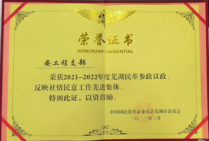 会议表彰2021-2022年度参政议政、反映社情民意工作先进集体、先进个人,民革RayBetApp官网下载 支部荣获先进集体荣誉称号,民革芜湖市委常委、支部主委魏利胜、支部副主委邓雄峰分别获得先进个人称号。
