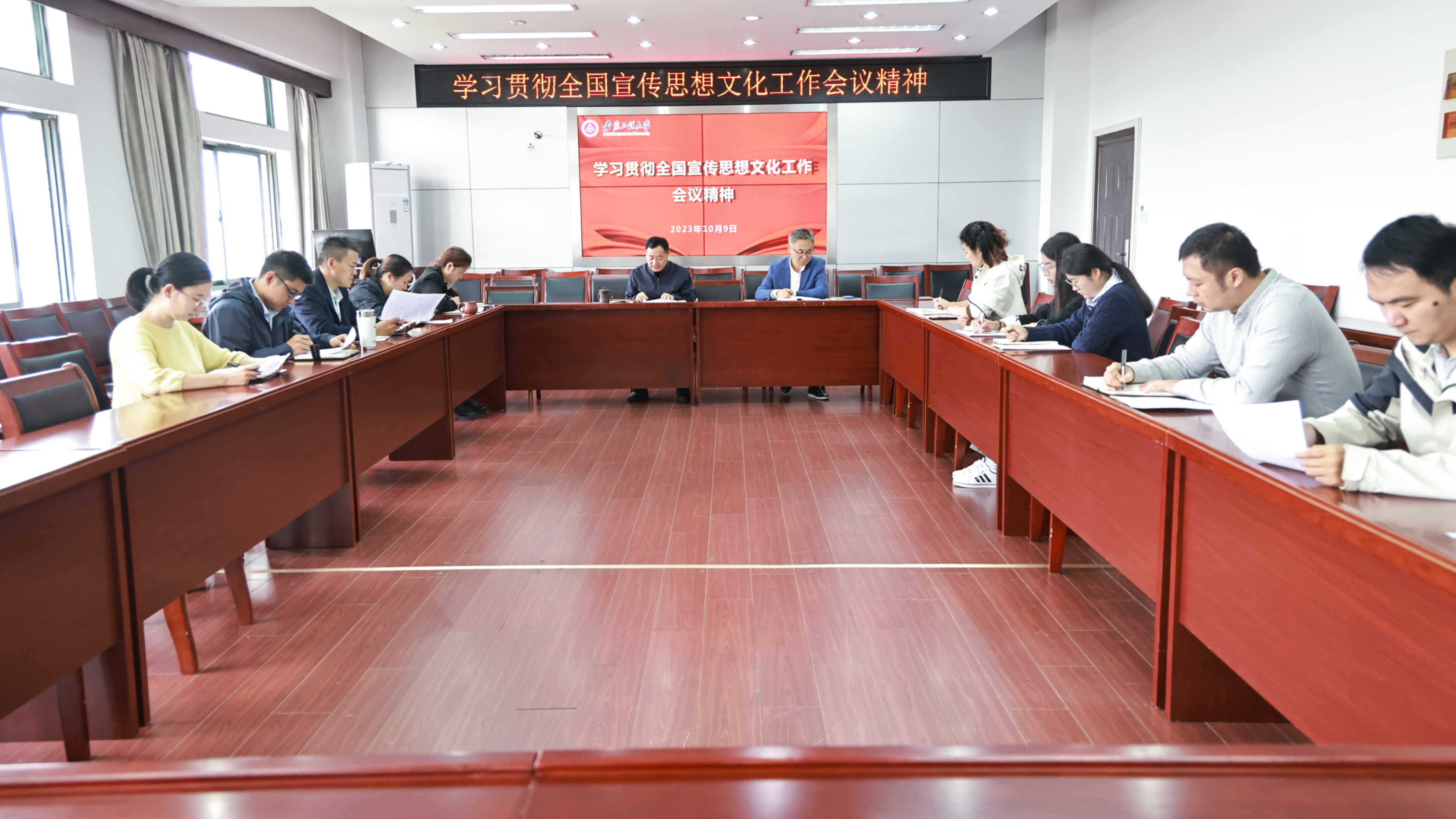 会议强调,宣传思想文化工作事关党的前途命运、事关国家长治久安、事关民族凝聚力和向心力,是一项极端重要的工作,全体参会同志要深刻领悟习近平总书记重要指示精神,深刻领悟“两个确立”的决定性意义,增强“四个意识”、坚定“四个自信”、做到“两个维护”。会议要求,宣传思想文化系统要认真学习贯彻全国宣传思想文化工作会议精神,以习近平总书记重要指示精神作为指导,在党的宣传思想文化工作一线落实政治责任、勇于改革创新,加强主流思想舆论引导、推动校园文化事业繁荣,不辜负学校党委、全体师生的期待与嘱托,不断为地方特色高水平大学、博士立项单位建设,学校高质量发展提供坚强思想保证、强大精神力量、有力文化条件。