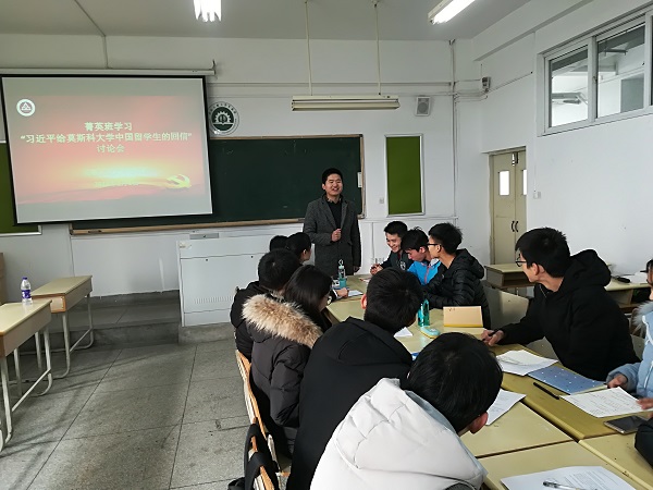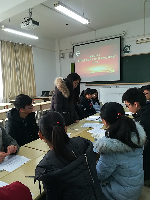 2018年1月1日新年伊始,校菁英班一期二期三期部分学员在4教308教室学习、讨论中共中央总书记、国家主席、中央军委主席习近平12月30日给莫斯科大学的中国留学生的回信。讨论会由一期学员钱磊、姚舒阳主持。校一、二、三期菁英班学员20名代表参加。 讨论会,首先从大家集体学习“回信”开始,“胸怀大志,刻苦学习,早日成长为可堪大任的优秀人才,把学到的本领奉献给祖国和人民,让青春之光闪耀在为梦想奋斗的道路上”,习近平总书记的谆谆教导和殷切希望,让人倍受鼓舞、催人奋进。 与会同学纷纷表示,这段时间,通过深入学习、贯彻落实党的十九大精神,对党情、国情、世情有了更清晰的认识,对走中国特色社会主义道路充满自信。祖国的进步与强大,让所有人感到自豪和荣耀。在学习了这封回信后,更是心潮澎湃,要让青春之光闪耀在为梦想奋斗的道路上,要珍惜新时代的机遇,将爱国之心化作报国之行。 通信161刘闯闯说,习近平总书记的这封信不仅是写给莫大留学生的,更是写给我们广大青年学生的。习近平总书记在十九大报告中就指出:青年兴则国家兴,青年强则国家强。青年,正是夯实基础、学习本领的大好时光,处于这个阶段的我们,要懂得肩上的担子并不轻,要担负历史使命,要以天下为己任,勤奋学习,努力敬业,服务社会,报效祖国,为人民谋幸福! “青年一代要有理想、有本领、有担当,国家就有前途,民族就有希望”,作为21世纪的大学生青年,中国的未来将由我们创造,身在大学的我们虽然生活安逸,但一刻也不能忘了艰苦奋斗,“幸福都是奋斗出来的”,努力奋斗才能让青春焕发光彩,才能实现成才梦、中国梦,计算机162史翔坚定地说。 给排水151包雅晴接着发言,习近平总书记在新年致辞中说:“九层之台,起于累土,要把蓝图变为现实,必须不驰于空想,不骛于虚声,一步一个脚印,踏踏实实干好工作。”而我们青年一代,树立远大理想是目标、是方向,有高志更当脚踏实地,将理想信念化为实际的奋斗。 材科152王琼琼结合自己实际说,作为一名大学生党员,看到习近平总书记的回信,很有感慨。正如菁英班的班训:担当,主动,坚持。我们肩上不仅有我们自己,有家庭,更有国家。青年正如毛主席所说的,是早上八九点钟的太阳,我们应该努力奋斗,奋勇向前。科学家黄大年曾有过这样一句话:“在果实累累的时候更能发挥价值”,我们要时刻将国家的利益放在首位。 自动化144的钱磊说,总书记的工作那么忙碌,却依然记挂着我们青年人的学习发展,拨冗为青年留学生们回信,可见他对我们广大青年的关心;另一方面也让我们认识我们肩上的重任。未来二十年,我们国家将实现全面小康,第二个百年奋斗目标开启新征程,正是我们新一代80后、90后乘风波浪,披荆斩棘实现个人理想抱负的黄金期,我们广大青年应当心中怀有我国,至诚报国,把个人的梦与祖国的复兴梦统一起来,始终不忘国家和人民寄托在我们身上的重托。 习近平总书记给莫大留学生的回信,意义重大,不仅是给莫大留学生的,也是给全体留学生的;不仅是给留学生的,也是给全体青年学生的。菁英班学员们,希望全校同学牢记祖国和人民的重托,把爱国之情、强国之志、报国之心统一起来,倍加珍惜祖国极不平凡的发展成果和来之不易的团结稳定大好局面,刻苦学习,掌握本领,勇作祖国的忠诚者、时代的奋进者、事业的搏击者,为实现中华民族伟大复兴的中国梦贡献自己的青春和力量。