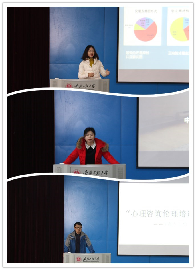 生化学院章文宜就参加第三期高校学生工作队伍能力提升培训班谈了体会,介绍了此次培训班的各场专题报告,重点剖析了网络时代学生思想特点及如何开展网络思想政治教育。生化学院胡艳瑾分享了高校学生资助工作规范化管理与资助育人机制模式创新研讨会的学习收获,介绍了浙江大学和长安大学在学生资助育人工作中的具体做法以及对我校工作实际的借鉴指导意义。体育学院王彦青就心理咨询伦理培训进行了汇报,介绍了咨询伦理的认识历程和三难冲突、专业伦理的意义和功能等,并结合我校实际对如何提高整体心理咨询工作提供了建议。