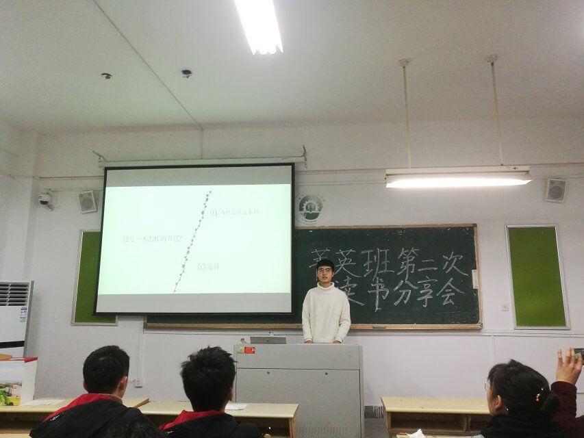 22、马佑佳 读书第二次分享会在周一召开,我很有幸被抽到了,而且是第二个。其实我没准备充足,但是在上场前我反复的练习了一下演讲稿,并不断安抚自己紧张的情绪。我想着,一定要把自己的感悟完整的表达出来。后来发现自己的确没有完完全全的表达出来,但是总算让自己得到了锻炼。同学们阅读的书籍类型很多,听完觉得自己读的书太少,读的类型也太少,我应该多读些科技方面的书籍,鼓励自己努力学习和前进,不能只局限于故事类书籍。最后老师讲话的时候,我意识到自己大学三年没有借很多书,真是没有达到菁英的标准,也没有达到大学生的标准。经过这次分享会,我意识到自己还要继续努力,多读书充实自己。 23、苏维维 本学期第二次读书分享会,有十三位同学作了分享。听完全程,我印象最深的是这本《你所走过的路都是必经之路》,从书名上来看像是一本心灵鸡汤,但陈小波同学的解读很有趣也很深刻;《牧羊少年奇幻之旅》通过沈子钰同学的娓娓道来让人感受到一种力量,人要有梦想,因为它是支撑我们前进的动力;还有《霍乱时期的爱情》《《红楼梦》与中国旧家庭》等等,这些书籍涉及到生活的方方面面,能够为我们看待世界提供更多的视角。陈老师总结时说的问题我也曾思考过,我们作为集体的一份子,仅仅做好分内的事是不够的,要有责任和担当,为集体贡献智慧和力量。 24、吴康辉 时隔已久的本学期第二次读书分享会在本周一晚上拉开了序幕,本次分享会进行了十三位同学的分享,听到他人的分享自己也颇受感触,能够在短短的两个小时内听到同学们分享的书籍,也扩大自己的读书视野。 25、贾文静 这一次的读书分享会我们有十三名同学分享了她们阅读了的书籍。她们的分享都非常的有趣且让人感受深刻。《牧羊少年的奇幻之旅》这一本书,给我的印象最为深刻。为了一个梦,就能够改变现有的生活轨迹,顺着一条自己从未走过的路,走下去。虽然路上有挫折磨难、有百种诱惑,也要沿着自己内心的路一直走下去。《杀死一只知更鸟》这本书中,谈到真正的勇敢是在行动之前就知道要失败,但还是要选择尝试。读书就是体会生活的过程,体会别人对于生活的感悟与经历并从中找到自己前行的方向! |
