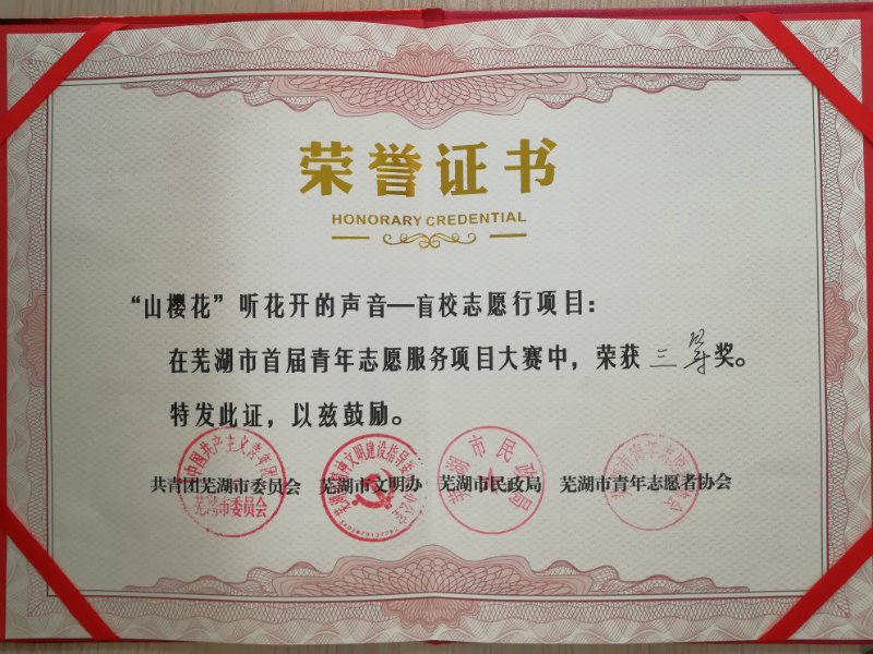 人文学院“阳光之旅”志愿服务队2013年在校申报了 “山樱花”听花开的声音——盲校志愿行志愿服务项目,从此,便与盲童结下了不解之缘。项目通过“一对一”结对模式,依托新媒体、体育运动及才艺展示,结合大学生志愿者的专业优势,为盲童提供了常态化、专业化的志愿服务。截至目前,累计志愿服务时长达24900小时,服务盲童200余名。该项目在第三届中国青年志愿服务项目大赛中获得国赛铜奖,并于今年的芜湖市首届青年志愿服务项目大赛中获三等奖,在9月29日的芜湖青年庆祝新中国成立70周年活动暨全市志愿服务精神分享会上受到表彰,被授予“芜湖市青年志愿服务示范项目”称号,受到了多家媒体关注和报道,引起社会广泛关注视障人士,弘扬志愿服务精神。