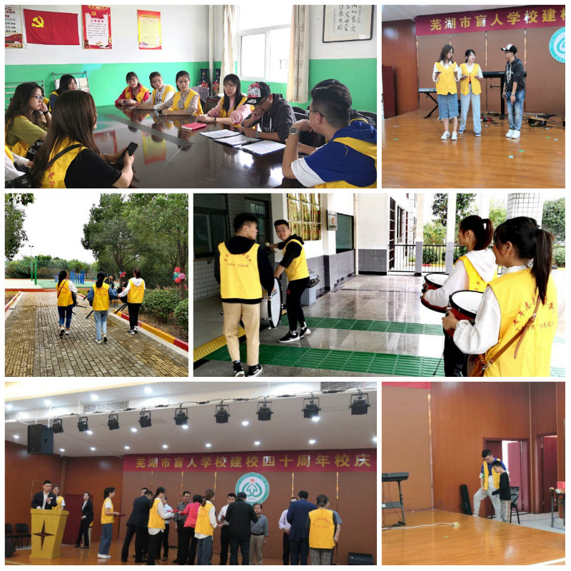 10月12日上午,芜湖市盲人学校建校40周年校庆典礼暨第36个国际盲人节活动在芜湖盲校多功能厅举办,芜湖市副市长汤劲松、市政府秘书长凤剑峰、市政协副主席陈怡、RayBetApp官网下载 副校长叶常林等领导出席本次活动。人文学院“阳光之旅”志愿服务队为此次活动提供志愿服务。 10月10日下午,人文学院“阳光之旅”一行志愿者来到芜湖盲校,为即将开展的活动进行相关培训和排练,志愿者们对人员进行了分工,把不同工作内容分配落实到个人,会议安排、现场走位、实地踩点,牢记每一个细节,为活动顺利开展做好充分的准备,直至暮色笼罩,志愿者们才乘车返校。12日早晨盲校校园里,到处都有“小黄人”志愿者的踪影,签名墙、校友休息室、爱心单位接待室“小黄人”们热情洋溢的做着接待工作。活动开始后,“小黄人”们开始充当了盲生的“保护伞”,化身为舞台上的“礼仪花”,每一个志愿者都认真做好自己的事情,在这个属于盲校师生共同的节日里,守护好他们的欢声笑语。