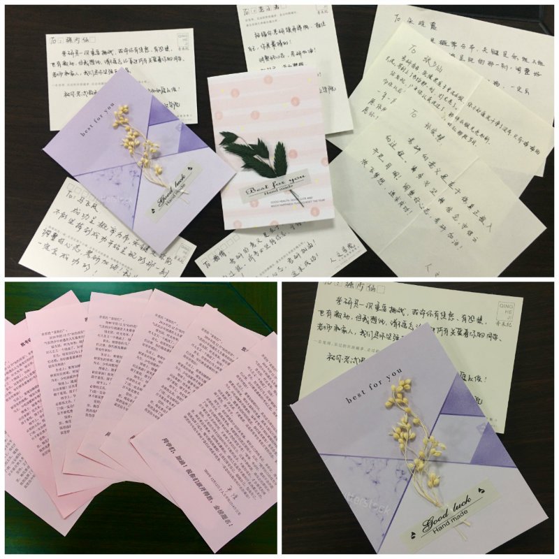 首先,老师们对各位同学表示亲切慰问,并送上精心挑选的备考文具,和满含期许与鼓励的亲笔祝福。“别驻足,梦想要不停追逐;不认输,熬过黑夜是日出”“都清楚,成功就在下一步;路很苦,汗水是最美的书;狂欢呼,相约在巅峰共舞”文字虽简,却囊括着大家对考研学子即将利刃出鞘的真切祝福;卡片虽小,却寄予着大家对考研学子必将凯旋的热忱期待。收到卡片和礼物后,考研学子们在惊喜之余,也纷纷对老师的关怀表示感恩。
