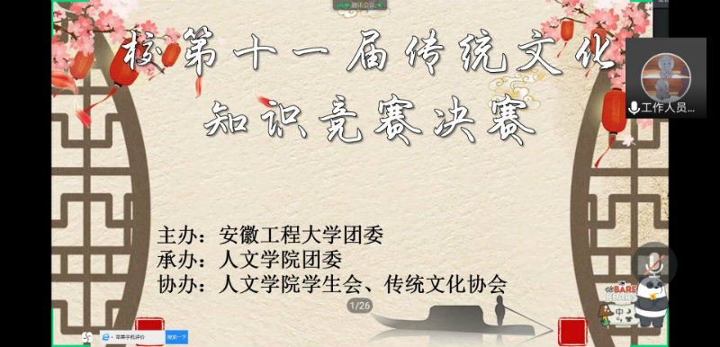为更好地传承中华优秀传统文化,彰显语言魅力,品味文化经典。6月7日,由校团委主办,人文学院承办,人文学院学生会和传统文化协会协办的第十一届传统文化知识竞赛决赛在线上举行。比赛特邀人文学院闫石老师,马克思学院李德才老师,校团委甘曼宁老师和人文学院辅导员王艳芝老师担任评委。比赛由宋子豪、舒晨敏主持。 千人相聚线上,同赴文化盛宴 本次大赛分为初赛、复赛和决赛三个阶段,共有来自全校12个学院5000余名学生报名参加,共同奔赴这场文化盛宴,展现了安工程学子积极向上的个人风采和渊博深厚的知识素养。题目涵盖政治、经济、文化、地理和军事五个方面,兼具趣味性与知识性,古今结合,包罗万象。小程序答题的形式更是兼顾了学生安全与比赛效率,便捷有趣,耳目一新,获得了同学们的一致好评。复赛中,“杀出重围”的192位同学组成小队,以精心制作的视频和随机抽取的题目进行对决,争夺进入决赛的名额。