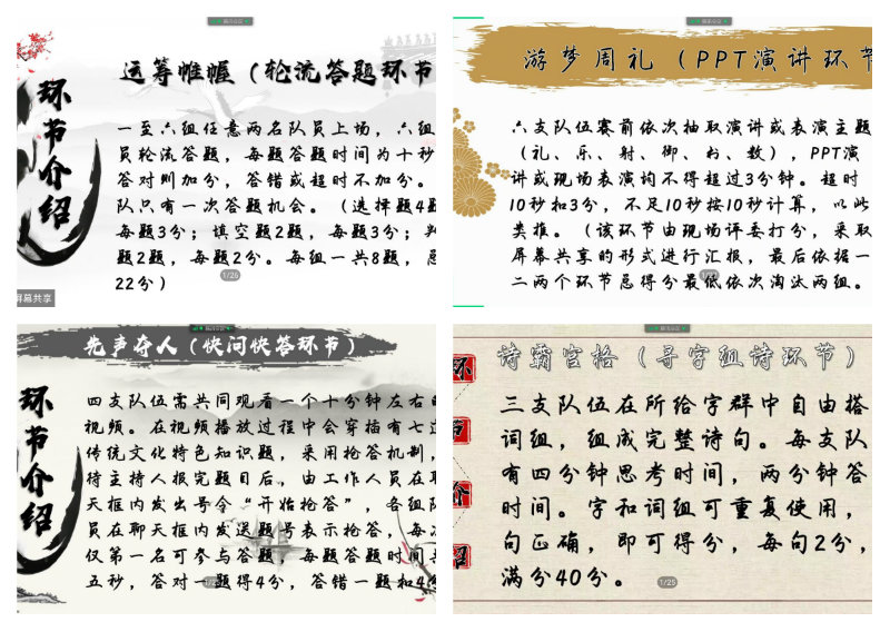 弘扬传统文化,展现今朝风采 经过层层选拔,六支队伍脱颖而出,进入决赛。此次比赛共分为“运筹帷幄、游梦周礼、先声夺人、诗霸宫格”四个环节。参赛选手们沉着冷静,有条不紊,通力合作,流利答题,展现出扎实的传统文化知识储备和优秀的团队作战能力,将整场的气氛推向了高峰。最后一环节的巅峰对决更是精彩纷呈,三支队伍你追我赶,不甘落后,选手们的非凡表现引得屏幕前的观众们阵阵喝彩。最终,翰墨中华传统情队表现出色,拔得头筹;终南队,白泽队获得二等奖,周行队,槐序之徽队,水墨云烟队获得三等奖。