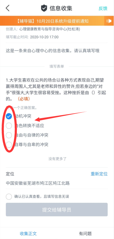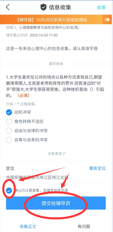 完成答题后 点击“确认” 点击“提交给辅导员”