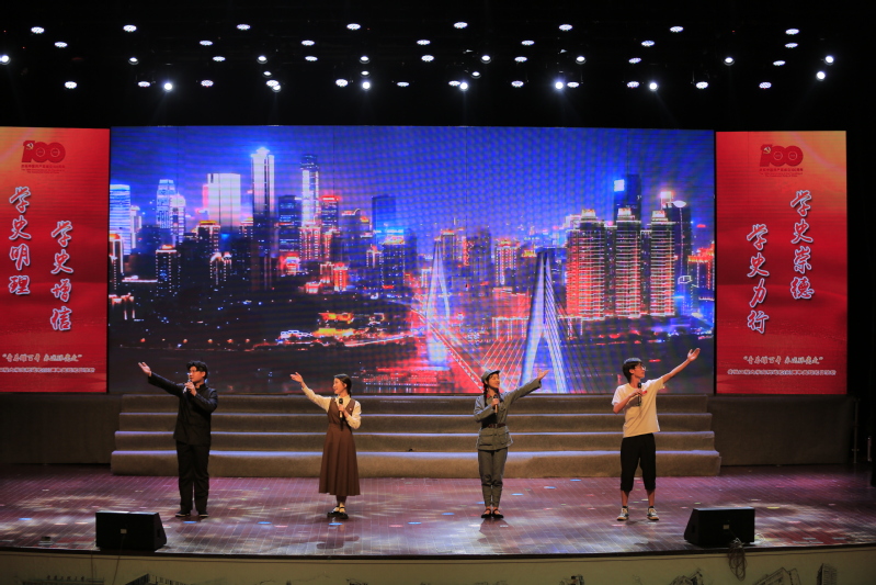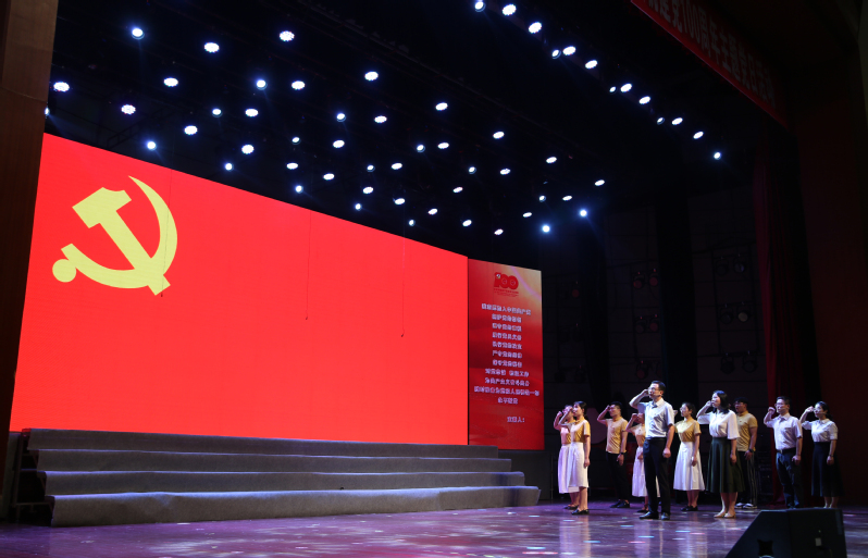 在活动中,离退休教师合唱团大合唱《追寻》表达了他们永远跟党走的初心,《我们是少年》更是生动演绎了他们历尽千帆归来仍是少年的奕奕风采。校党委宣传部、校工会、校团委拍摄的《一堂生动的党史课——特殊党费映初心》讲述了我校离退休党员荚新民把“50万特殊党费”作为“传家宝”的故事。校大学生艺术教育中心同学们带来的朗诵《我们的青春》展现了一代又一代中国青年砥砺向前、谱写时代华章的青春印记。历届校园十佳歌手代表共同演唱《唱支山歌给党听》,彰显新时代青年爱党爱国爱社会主义的情怀。大学生党员的微党课《延乔路尽是繁华》中,陈延年、陈乔年两位年轻的共产主义战士的革命事迹感染全场。师生党员代表的主题演讲《我是党员》,彰显了党员教师为党育人、为国育才的使命担当,展露了优秀学生党员青春向党、奋进时代的心声。我校教师党员代表吴小太与党员代表站在舞台、面向党旗庄严宣誓,全场党员集体重温入党誓词。