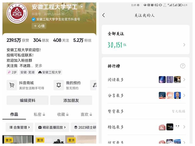 坚持内容创新,加强品牌培育。构建“一体两翼”易班工作梯队,充分发挥学生主体性与教师主导性作用,优化师生作品供给质量。组建新生学长导员队伍,在新生入学前帮助新生提前了解校园生活,解答各种疑问。目前易班学生团队运营的新媒体平台总粉丝数突破9万人,其中抖音粉丝5.2万人,与全国300余所高校建立友好关系。学工部微信公众号粉丝突破3万人。“易班”已在新生心中形成良好形象。