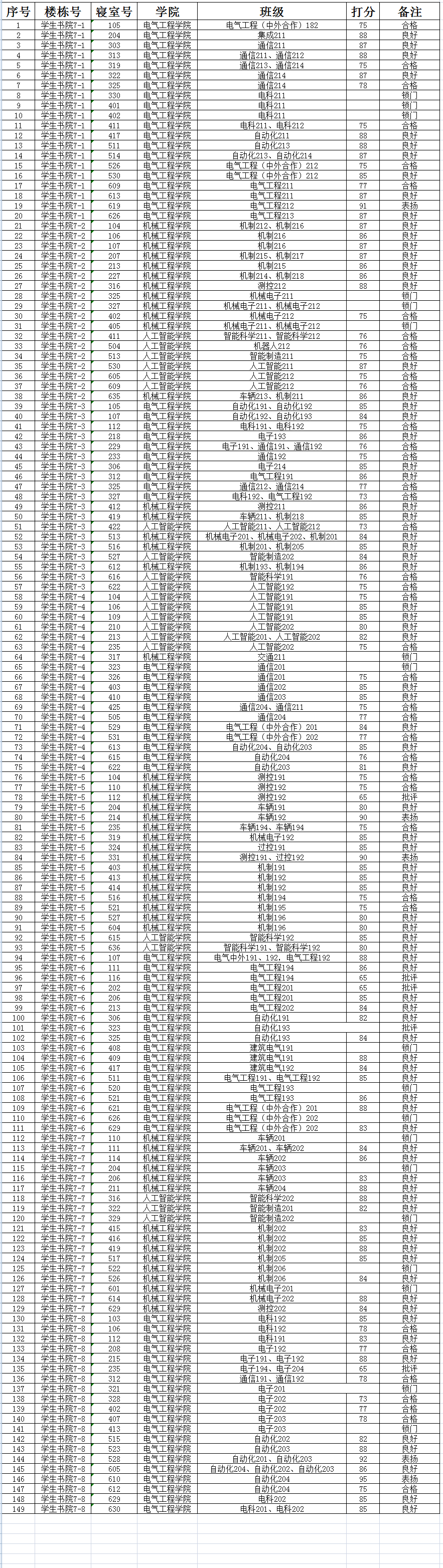 2023年5月份国际工程师校区宿舍卫生检查成绩统计表