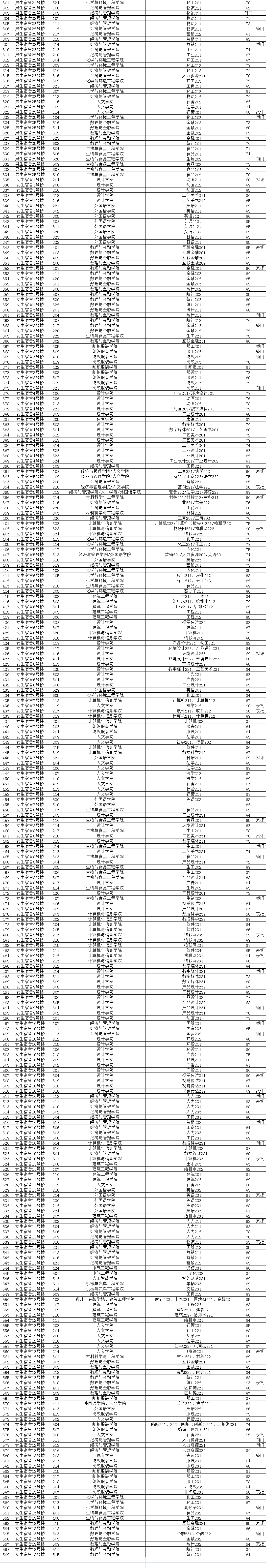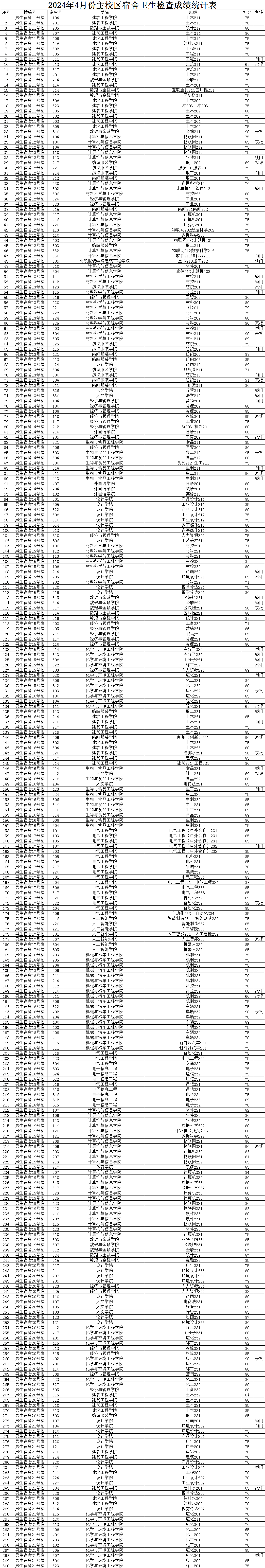 2024年4月份主校区宿舍卫生检查成绩统计表