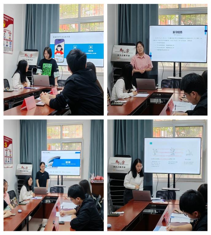 经过班级宣传和推荐,共有4名学生作为“求职者”参加本次活动。比赛严格按照结构化面试流程进行,“求职者”分别从基本信息、校园经历、社会实践经历、对应聘岗位的理解等方面进行自我介绍,再根据“面试官”给定的问题发表自己的观点。模拟面试结束后,“面试官”根据自身求职经验,从PPT制作、语调语速、面试态度与应变能力等方面对“求职者”的表现进行点评,并提出优化建议。