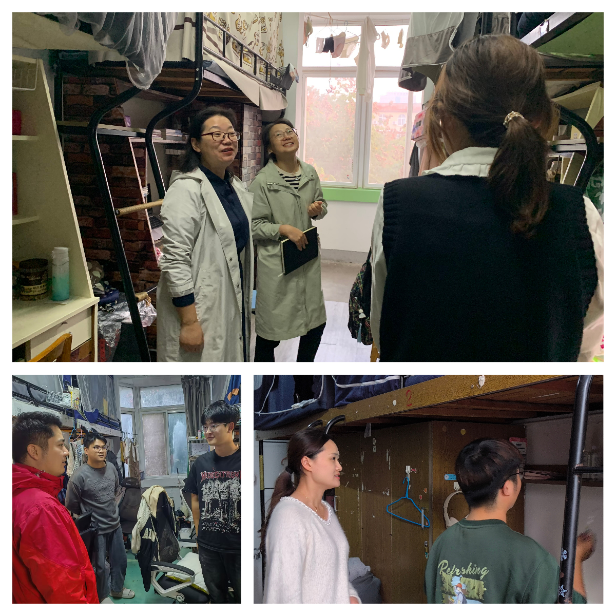 在院学生会每周查寝的基础上,学院党政领导结合时间节点,带领专业教师、专兼职辅导员常态化开展寝室安全卫生检查活动,围绕“三全六专”育人实践,扎实开展学生管理工作,通过宿舍走访,守牢“寝室安全”红线,并建立良好的师生沟通机制,为学生教育培养打下坚持基础。 (文:孙力力;图;辅导员团队;审核:孙德茹) |