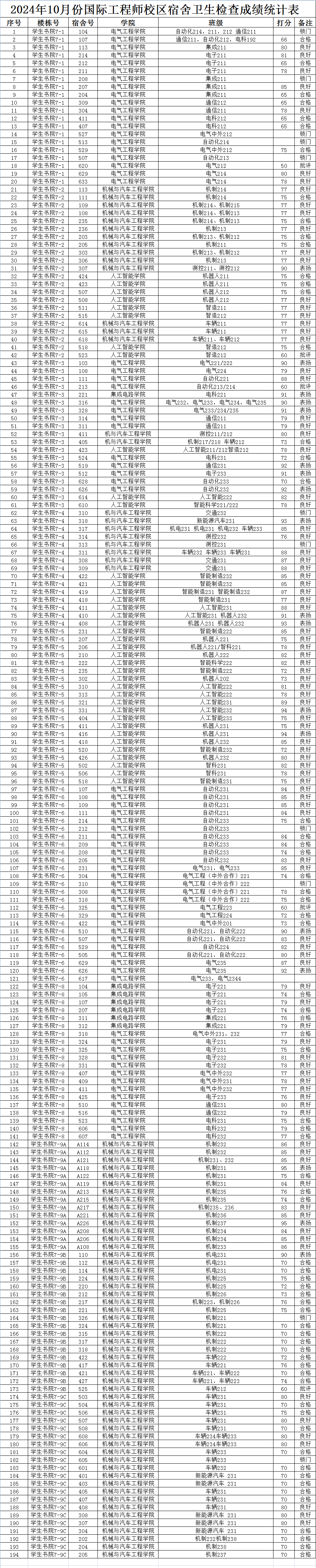 2024年10月份国际工程师校区宿舍卫生检查成绩统计表