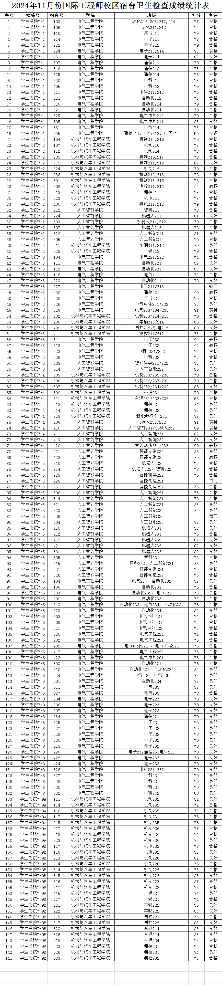 2024年11月份国际工程师校区宿舍卫生检查成绩统计表