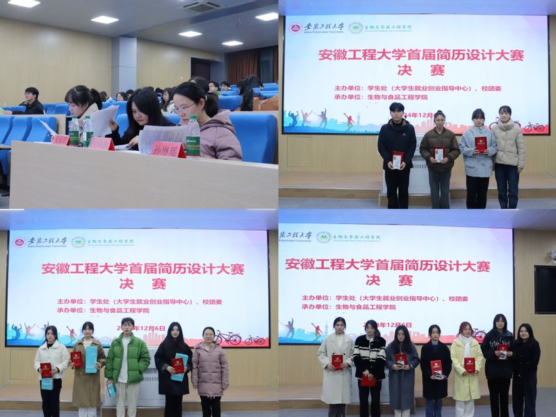 12月6日,由我校学生处(大学生就业创业指导中心)和团委主办,生物与食品工程学院承办的校首届简历设计大赛决赛在5J217教室举行。经现场评审,设计研24王君等3名同学获得一等奖,计算机拔尖221张结婷等4名同学获得二等奖,人力231许雅晨等5名同学获得三等奖,营销221巫勤雯等8名同学获得优秀奖。 本次大赛历时半个月,吸引了来自全校300余名同学的参与,经过初赛角逐,共有20名选手晋级决赛。研究生部研究生管理科科长吴辰君、团委组织宣传科科长孙琳瑶、学生处创业指导科副科长王鸣鹃担任本次决赛的评委。