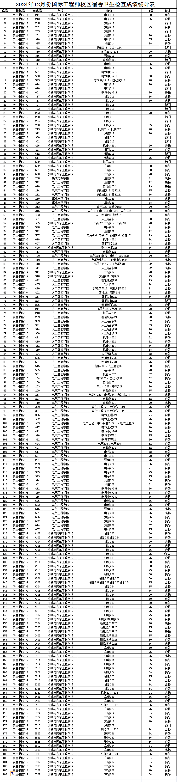 2024年12月份国际工程师校区宿舍卫生检查成绩统计表