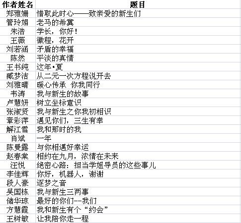 为进一步加强和推进我校学长导员工作,了解学长导员工作的酸甜苦辣,分享、交流工作经验,为今后促进学长导员工作提供鲜活的事例,学工部举办了“我与新生”学长导员工作征文大赛,收到征文36篇。经过评审,现评出一等奖3篇,二等奖6篇,三等奖9篇,优秀奖6篇。具体名单见附件。