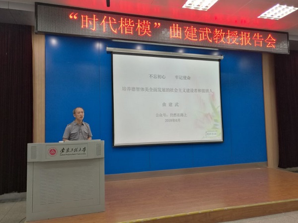 曲建武1982年从辽宁师范大学毕业后,留校任辅导员,他从辅导员做起,做过学院党总支副书记、学生处处长、学校党委副书记、省委高校工委副书记、辽宁省教育厅副厅长、巡视员(正厅级),2013年,出于多年来对学生工作的热爱,他主动辞去领导职务,毅然回到高校教书育人第一线,做一名普普通通的本科生辅导员和任课教师。曲建武结合自身30多年丰富的职业经历和工作实践,围绕不忘初心,牢记使命,以德立身,以德施教,向大家讲述了什么是大学教育,如何做好大学教育,分享了坚持做大学生人生成长的指导者和引路人的心得体会和工作经验。他鼓励广大同学要做到习主席在北京大学师生座谈会上对广大青年提出的几点要求:要爱国,忠于祖国,忠于人民;要励志,立鸿鹄志,做奋斗者;要求真,求真学问,练真本领;要力行,知行合一,做实干家。曲建武教授通过丰富的案例、珍贵的照片,与学生相处的动人故事,展现了一名教育工作者对学生、对教育的一片赤诚。“老师对学生有爱,就不会有代沟”,“学生工作要带着灵魂去行走”,“同学们要选择去祖国最需要的地方”,“把对的事情坚持做下去”,“成才要有大格局”……曲教授的精彩语丝象一个个思想火种点播在每个人的心间,会场时时爆发出热烈的掌声。