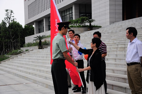 苏国红郑重向2018级新生军训教导大队授旗后,作了热情洋溢的讲话。她说,退役复学的同学通过军旅生活的磨炼,拓宽了视野,增长了见识,培养了责任和担当,变得更加坚韧和成熟,有很多人在部队立功受奖,表现突出。国旗班成员,作为国旗的忠实守护者,有着团结的气氛、向上的思想、过硬的素质、严谨的作风。能够被选拔成为军训教官,这是学校对大家的信任,是光荣的任务。你们是校内的一道风景,是学校的一张名片。大家将作为一名教官,在武警部队的统一领导下,执行威严的号令,对全校5300余名新生开展军事训练。希望大家以军人的形象,过硬的专业素质,科学有效的训练方法,当好指挥员,会讲解示范、会纠正动作、会组织训练、会做思想工作,以饱满的精神状态,展现战士的刚毅、军人的品格,传承部队的光荣传统,严格要求自己,严格要求同学,不折不扣地落实军训要求,达到“掌握基本军政技能,加强组织纪律性,增强爱国拥军意识”,保质保量完成军训任务。