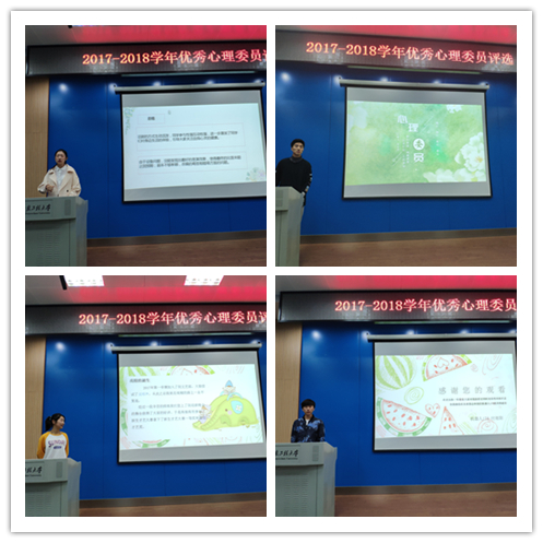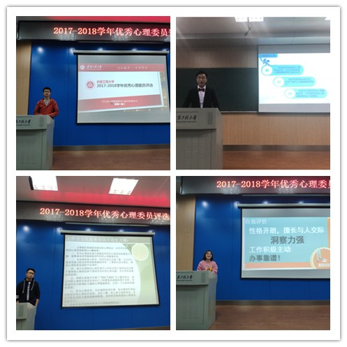 为进一步加强我校班级心理安全委员队伍建设,表彰先进,发挥班级心理安全委员在宣传普及心理知识、做好心理危机预防、促进和谐校园建设、提高学生心理素质方面的作用,激励广大学生心理工作者奋发向上,锐意进取,校学生处于2018年10月29日在五教录播教室举办了 2017—2018学年“优秀心理委员”评选活动。本次评选经过了个人申请、辅导员审核、学院推荐、学生处心理中心初选四个环节,最终有37名同学进入最终评选,本次评选评委由校学生处心理中心老师和学院心理健康联络员共同担任。